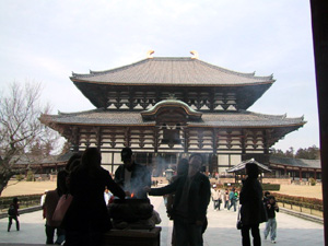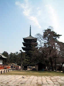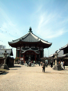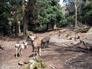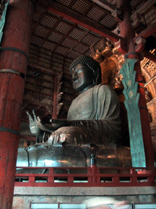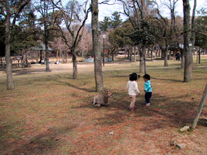 After this, I headed out to Nara, a city to the south of Kyoto. Nara has a huge temple complex which has several hundred tame deer wandering around its precincts. You can buy special deer biscuits (I declined) and, for maximum enjoyment, hand them one at a time to a small child who will then be terrified by the arrival of several deer to receive the goods. Child then tries to run and is pursued by several deer around the park. Much fun for all. The temple buildings were also all quite pretty, supposedly including the largest wooden building in the world. One of the pillars holding the temple up had a hole cut through it which was supposedly the same size as the Buddha's nostril and people would try to squeeze through the hole to gain enlightenment. This was reasonably straightforward for children, but watching adults trying to get through was often quite amusing.