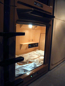 Tuesday, I returned to a Starbucks and wrote some postcards before taking what was the fastest train in the world, the Nozumi Bullet Train, to Tokyo at 186mph. I think a maglev train in Shanghai now goes at about 250mph but only covers 19 miles... Anyhow, the Nozumi Superexpress was really fun and got me into Tokyo at 3pm. I whiled away some time in Ueno station's Internet cafe before heading onto the Riverside Capsule Hotel. I had wanted to try a capsule hotel at some stage and this seemed like a good opportunity.