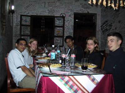 We arrived in Nazca after dusk. It was suspected that it would be quite difficult to see the Nazca lines in the dark (even using Chris's extra blue torch) and, although the original plan had been to head directly on to Arequipa that night, we decided to stay overnight in Nazca and to see the lines next morning. We checked into the Hotel Alegria, two rooms of 3 people, and then headed down into Nazca for dinner. The guidebook suggested a restaurant which had lots of graffiti on the walls and indeed we spent a lot of the time reading the various comments that previous diners had left. We were also provided with our first free Pisco Sours, an interesting drink with a foamy head that is served in the region and which I (alone) thought was quite pleasant. While we were sitting at the table, a small, hand-bag sized dog trotted past and barked a friendly welcome to our group. This startled Zoe and Lyndsey to the point that they both leapt 6 feet into the air and screamed, a reaction which then provided a good 5 minutes of solid laughter!