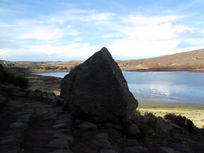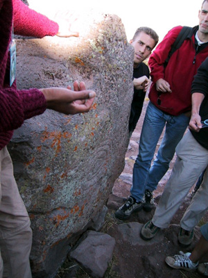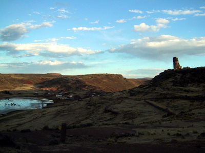 The site was beautiful. A small peninsula into a lake rising into a small hill, upon which different types of funeral towers had been constructed. On the way up the hill, Elisia showed us a rock with a puma's head and a spiral carved into the side. He asked if anyone had a compass with them and, as it happened, I had mine in my coat pocket and handed it over. Elisia showed us that, as he moved the compass down beside the rock, the needle spun through 360'. Quite impressive.