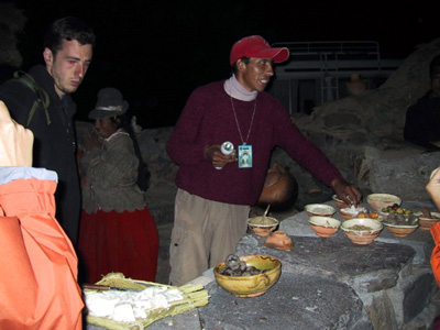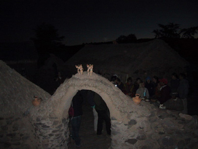 After seeing a few of the towers, we began to head back to Puno. Elisia offered to take us to both the museum and a little farm nearby and we agreed that this sounded like fun. The guide book wasn't joking when it said the museum was 'small'. I suspect there were less than 10 display cases, although one did include the remains of a couple of mummys (including the lama dung which they had replaced the stomach with... never did quite work that one out). Anyhow, we continued on the bus to the farmyard. It was extremely impressive. We considered our Hostel to be a tad on the cold side, but how people could sleep in draughty, stone walled, thatched shacks, with no electricity or running water, is beyond me. None-the-less, the people in the house had prepared some food for us and I tucked into some freshly boiled potato. Yum!