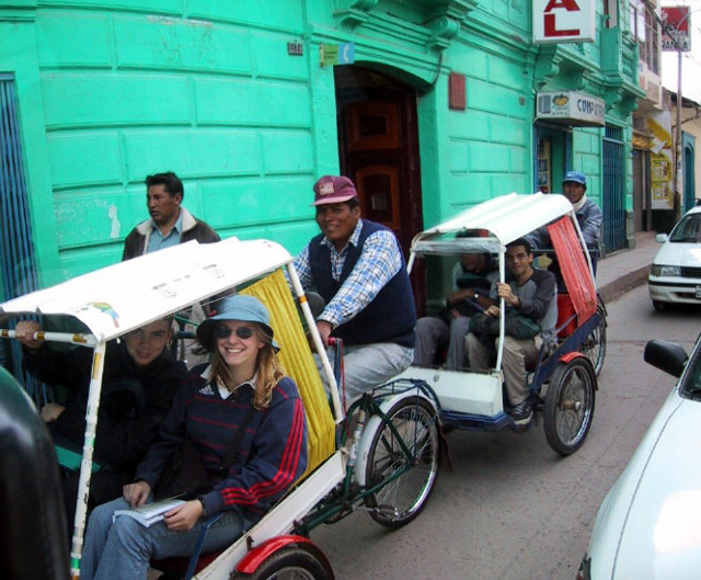 The bus came along and we piled in. We stopped again outside the train station and were joined in the back row by Taco from Japan, and a guy from the Netherlands. We headed into the congestion of the city. In the distance I head a cry of "My hat blew right off!" Sure enough, over on the far side of the bus were Zoe and James sitting in a pedalo. I tried to shout to Zoe but ended up irritating everyone on the bus instead. So I banged on the back window as we passed them and caught Chris and Jamal's attention in their pedalo. They gave chase through the streets before we headed up into the hills behind Puno to the alto-plano (or something like that).
