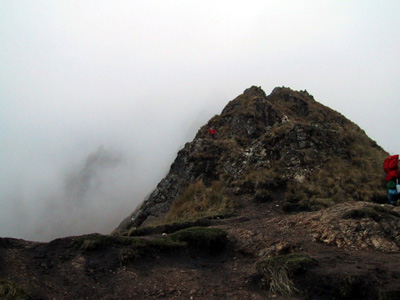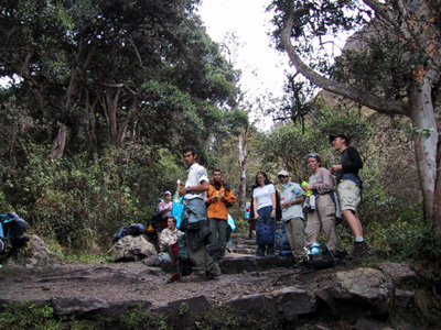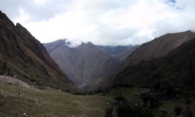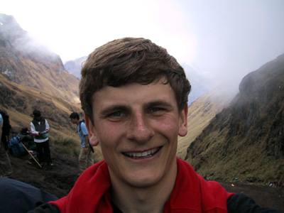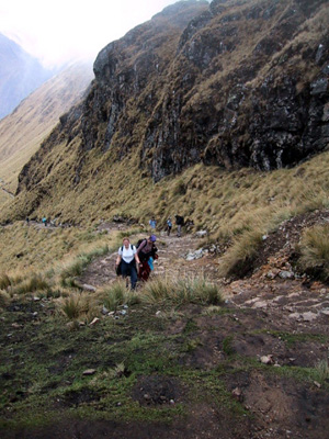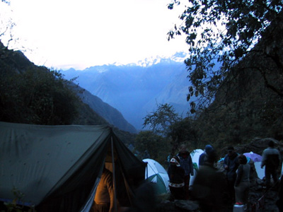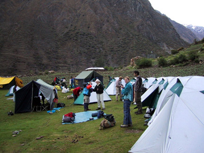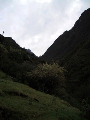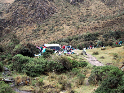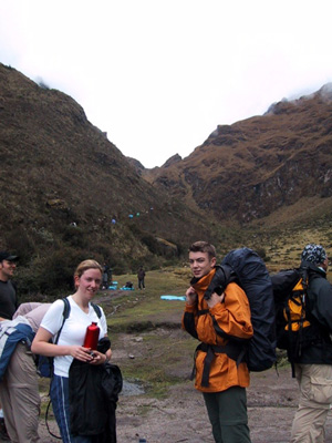 Up above us we could see Dead Woman's Pass at 4200m, flanked either side by snow capped mountains. We headed up the hill, first through forest and then latterly across barren hill-side terrain. Augusto paced us for the first part of the walk and then left us to our own devices for the remainder. After much slog, we eventually reached the summit at around 1pm ish. We sat and waited for everyone else to arrive, before we headed back down the other side. The campsite was only about an hour away and we had opted to have lunch at the campsite rather than risk staying out on the trail any longer than we had to in case it started to rain again. James and I, both carrying our rucksacks, made similar progress and so we walked together. Luckily, we had just arrived in the campsite at Paqaymayo when the rain we had dreaded suddenly reappeared. There were others behind us, some of whom ended up much wetter than others. Lyndsey, however, disappeared. She had only been minutes behind the Dutch girls, Els and Esmerelda, but she didn't arrive. About 15 minutes after she had disappeared, we began to get quite worried about her and so Augusto and Aldo and a few of the porters started searching for her in the rain. It didn't take long to find her. She hadn't missed the campsite; she hadn't had a nasty fall; she hadn't even been abducted - she had taken shelter from the rain in the toilet block at the far end of the campsite and was waiting for it to ease! Phew!!