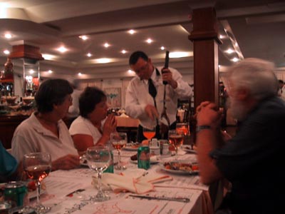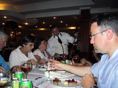 Our final stop that evening was an all-you-can-eat meat restaurant. The waiters wandered around carrying large hunks of meat on skewers (except the rib man, who had his own mobile BBQ affair) and would, if you desired, cut you a lump of meat from the skewer. Various cuts of beef (including sirloin steak), pork, lamb, chicken in bacon, chicken hearts, etc. were appearing at the table at a frequency that had to be seen to be believed. Thankfully, the waiters also poured your drinks, for in order to keep pace with the arrival of new hunks of meat, one had to just keep shovelling the food in the gub. By the end of the main course, we were already substantially overfed. The arrival of a desert trolley was, therefore, a challenge. I selected a couple of pieces of cake and managed to get through them alright. Stephen Boyle’s aspirations of tidying off a passion fruit mousse, however, proved insurmountable and so I offered to do the duty. Unfortunately, I too suddenly realised just how full I was. By the time we came to leave the restaurant, I still hadn’t finished it - so I took it with me.
