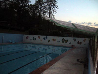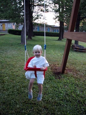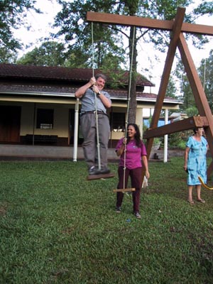 After lunch, some of the Brazilian children arrived. One girl had obviously spent considerable time drawing us pictures to take home with us. It was great to see them playing on the newly hung swings and climbing frame. Once they had left, work began on the zip line. It was decided that the support hoop on the playground needed to be raised and so some effort was expended to get the necessary frame in place to carry the weight. At about 3pm, it seriously looked as though rain was going to thwart the completion of the work, but thankfully it passed over reasonably quickly, and so we returned to work. The cable was hoisted up the first tree and bolted in place. At the second tree, it was also hoisted into position and, summoning the last of our energy, tensioned and locked in position. I volunteered for the first run. After untying the pulley system Tommy had built, I counted to three and launched myself off the platform. The initial rush of speed was good, but it also became immediately apparent that we still hadn’t quite got the tension in the wire rope quite right. I was quite rapidly descending towards the grass. By the time I was close to half way, my rear end was only inches above ground. This, however, was something of a blessing when the ride came to an abrupt end as the pulley system locked up. It transpired that the rope had somehow jumped out of the mechanism and had jammed solidly against the frame holding the pulleys in place. It was a slight disappointment, but it was already late in the day and we had to concede that it would be another job to be left for after our departure.