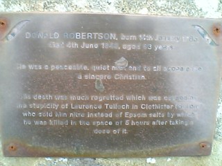 DONALD ROBERTSON Born 14th of January 1785 Died 4th June 1848, aged 63 years. He was a peaceable quiet man; and to all appearances a sincere Christian. His death was much regretted which was caused by the stupidity of Lawrence Tulloch of Clothister who sold him nitre instead of Epsom salts by which he was killed in the space of 3 hours after taking a dose of it. |